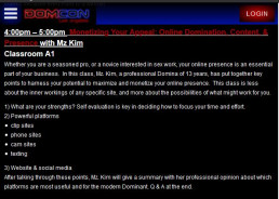 "Whether you are a seasoned pro, or a novice interested in sex work, your online presence is an essential part of your business. In this class, Mz. Kim, a professional Domina of 13 years, has put together key points to harness your potential to maximize and monetize your online presence. This class is less about the inner workings of any specific site, and more about the possibilities of what might work for you.