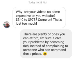 I get this question once in a while. "Why are your videos (sessions, calls, etc) so expensive?" Response: Solve your problems by becoming rich, instead of complaining to someone who can command these prices.
